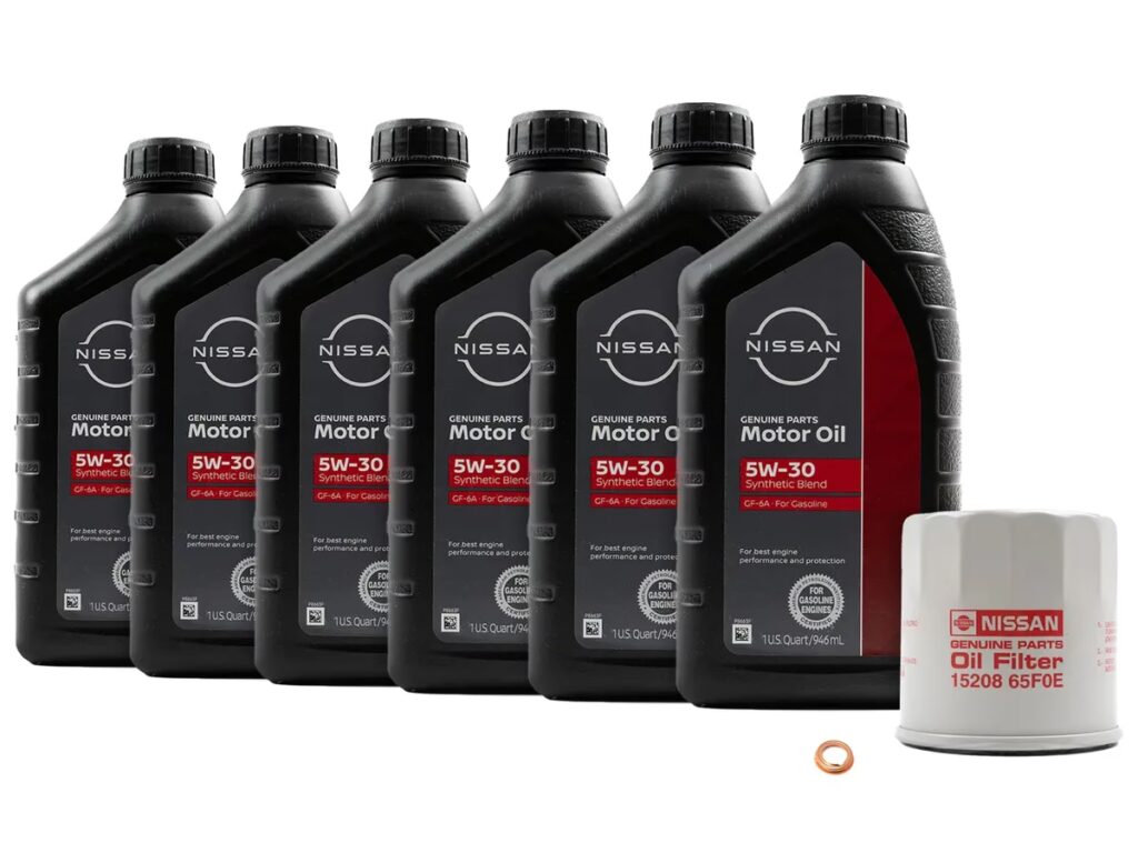I recommend changing your oil once every 6,000 Kms or 4,000 Miles. I use 5 Litres of Mobil Synthetic 5W30 + Fram Oil Filters, OEM one claims to have a relief valve, but Nissan always likes to make you buy their products =), I have no problems with FRAM Oil Filters and I've been using them since day one on all my cars.