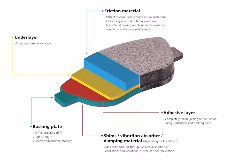 | Friction Material | Often semi-metallic or low-metallic compounds, aggressive for grip | Ceramic or organic compounds, softer for quiet operation |
