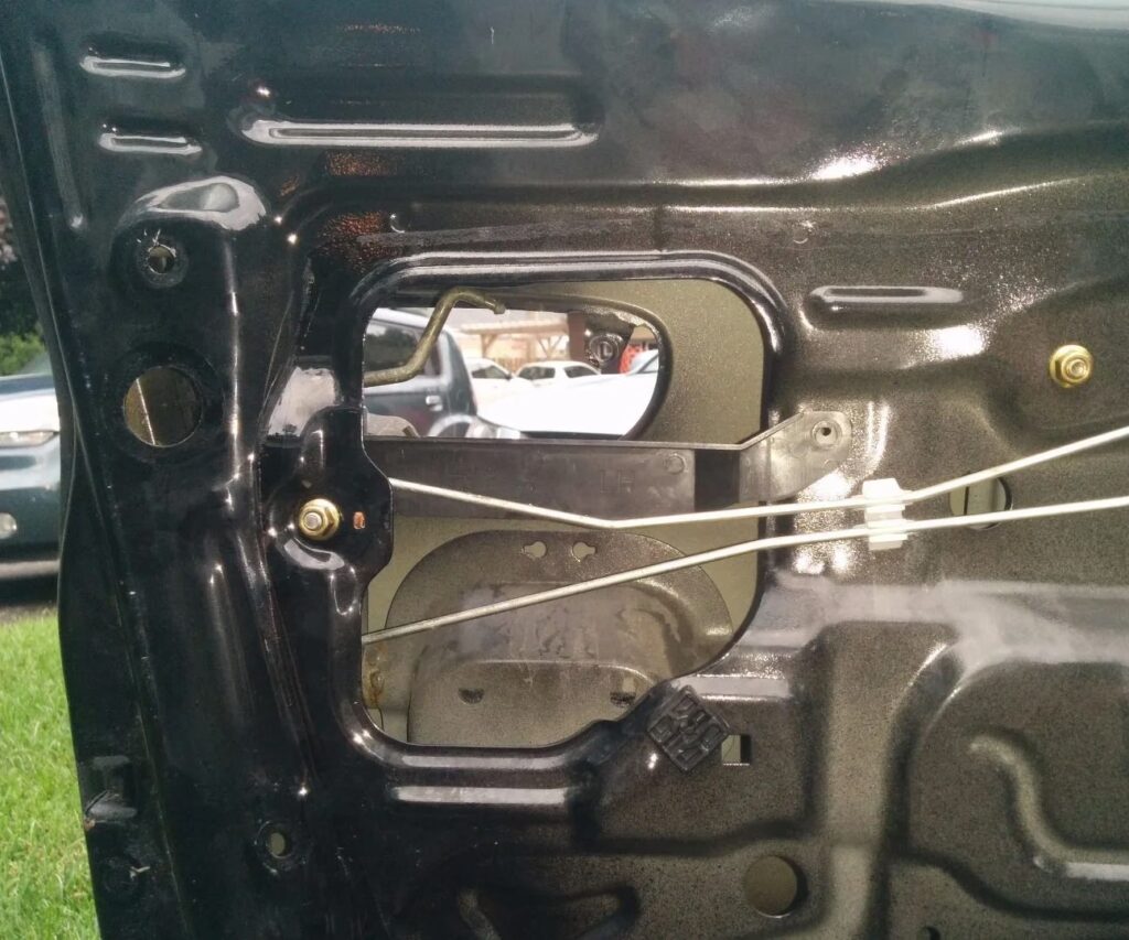 1. Visual Inspection of Interior: Inspect the interior of the door cavity for any signs of damage or wear on the handle mechanism. Look specifically for broken or disconnected rods (thin metal bars), damaged cables (often Bowden cables, similar to bicycle brake cables), or loose screws securing the handle assembly.