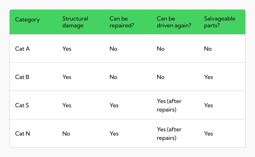 | N/A | CAT S | Type of damage (structural) | Yes, after professional repair | Damage to vehicle's structural frame or chassis. |