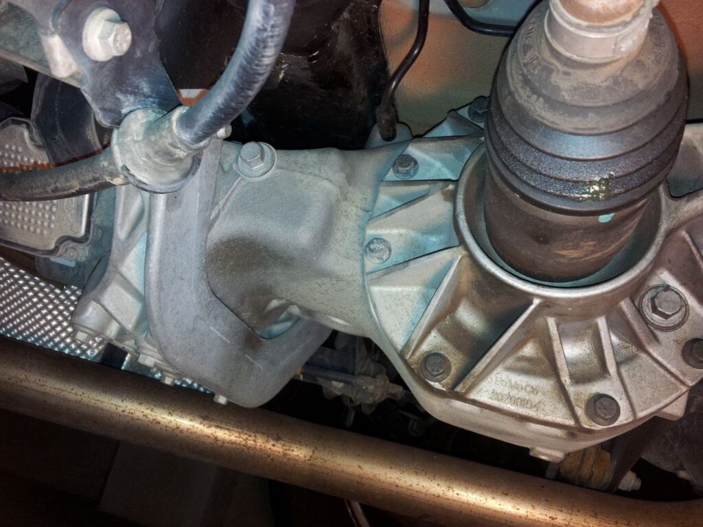- Fluid leaks: Visible leaks around the differential, transfer case, or gearbox housings.