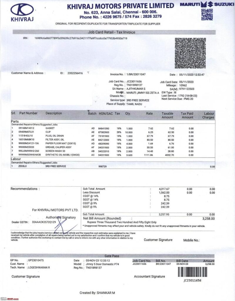 Standard Service Items & Quantities for Jimny 4 (K15B)