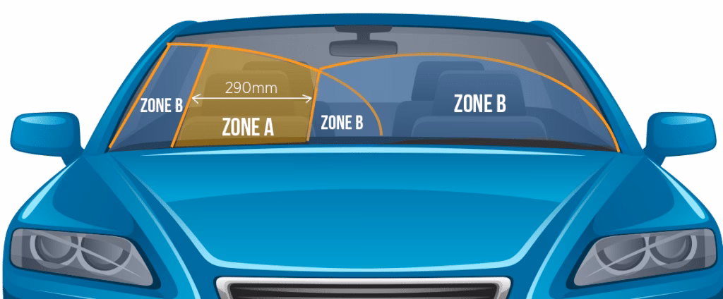 - Zone A: This is the most critical area. It is defined as a 290mm-wide strip directly in front of the driver’s seat, centred on the steering wheel. This zone represents the driver's primary line of sight, where even small obstructions can have a significant impact on safety. Any chip or crack larger than 10mm within this Zone A will result in an automatic MOT failure.