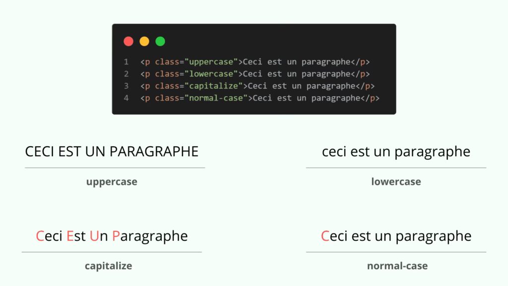 Il y a aussi une autre propriété CSS qui permet de forcer les majuscules: text-transform. Elle peut prendre ces valeurs : capitalize, uppercase, lowercase, none. La propriété letter-spacing permet de spécifier l'espacement entre les caractères du texte.