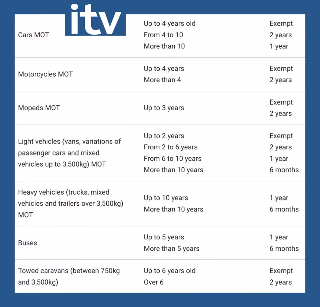 | Vehicle Type | UK MOT Frequency | Spanish ITV Frequency |