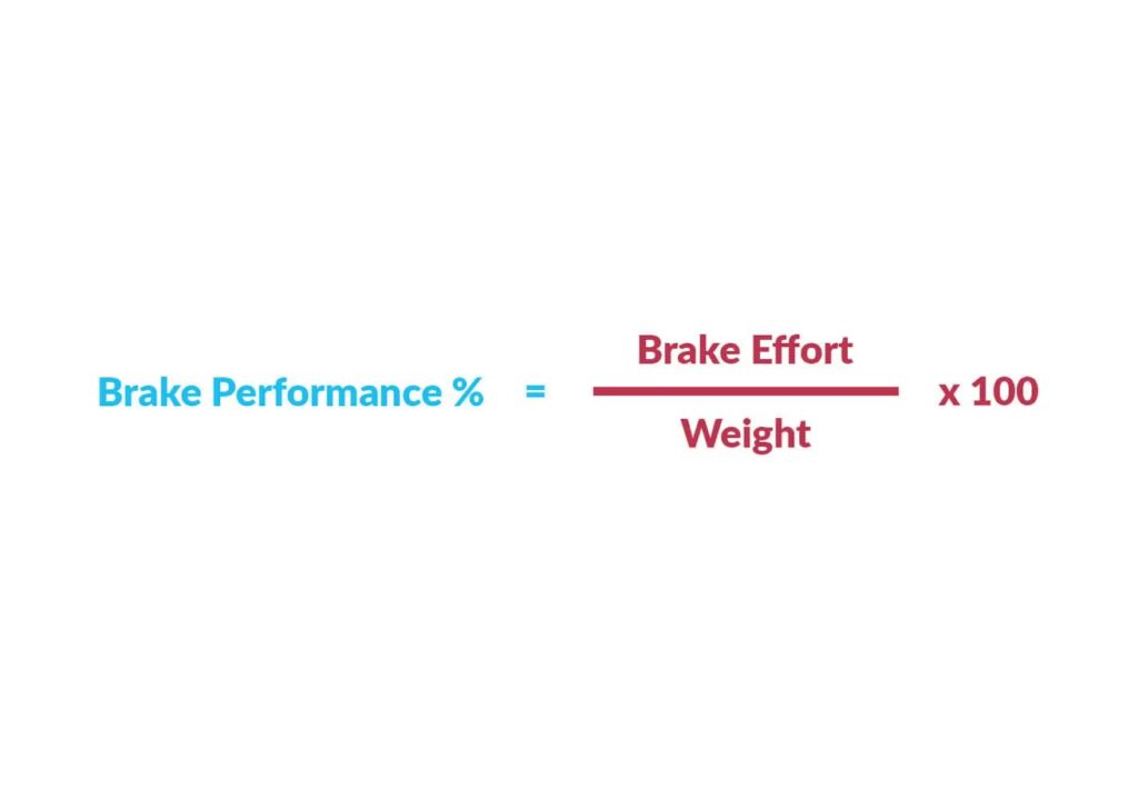 Brake Efficiency (%) = (Total Braking Force / Vehicle Weight) x 100