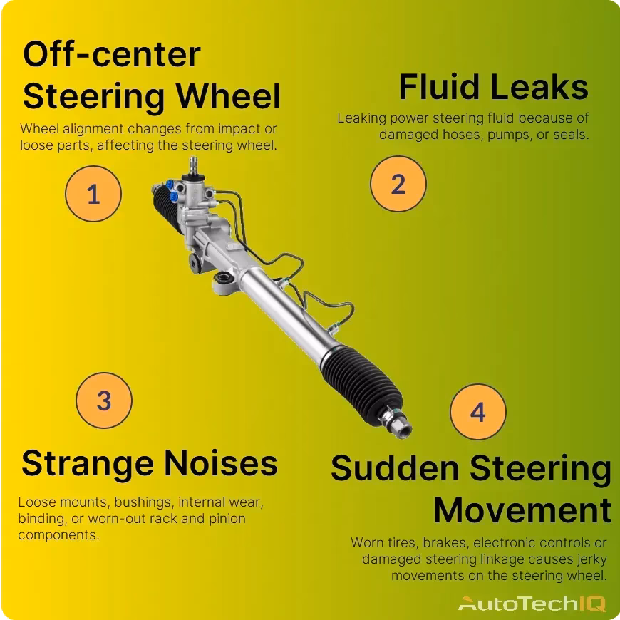 • Visual Inspection: Check for obvious signs like fluid leaks, torn steering rack boots, bent components (tie rods, arms), or cracks in the housing. Examine the condition of all visible bushings and mounts.