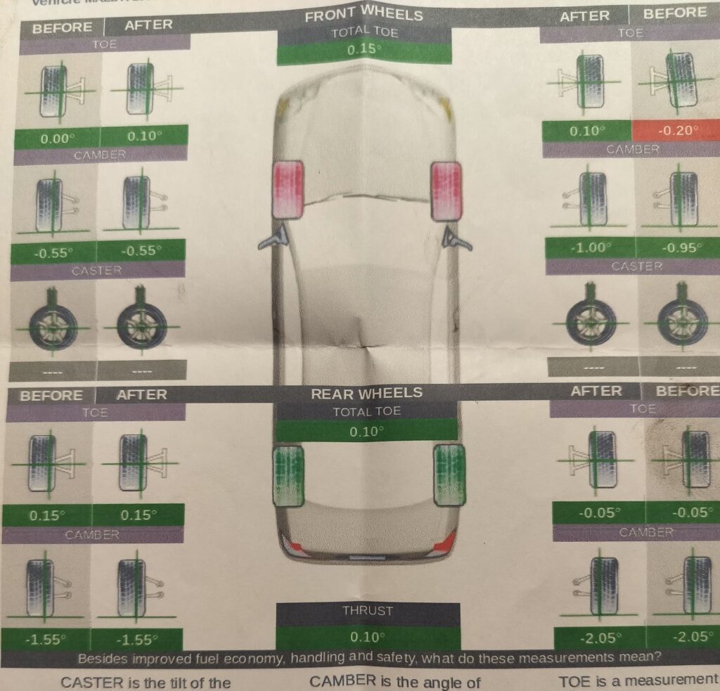 Wheel alignment, often referred to as geometry, involves a series of precise measurement checks and adjustments to ensure your wheels are pointing in the correct direction relative to the road and to each other. The key components of a wheel alignment are: